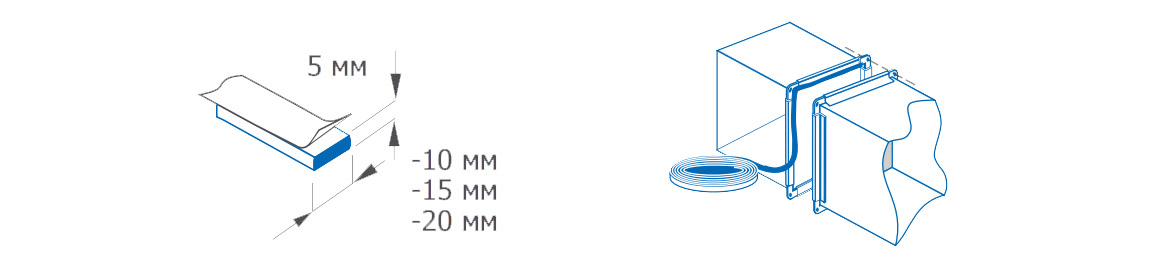 С одной стороны на межфланцевую самоклеящуюся ленту нанесен клеевой состав, обеспечивающий легкость и удобство ее фиксации. В процессе монтажа воздуховода или другой конструкции самоклеящаяся уплотнительная межфланцевая лента закрепляется по периметру каждой шинорейки, поверхность которой предварительно очищается и тщательно обезжиривается.