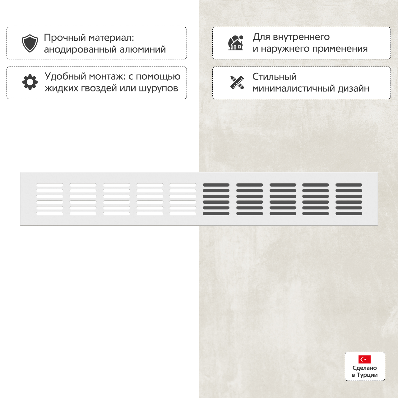 Прямоугольная вентиляционная решетка изготовлена из анодированного алюминия.