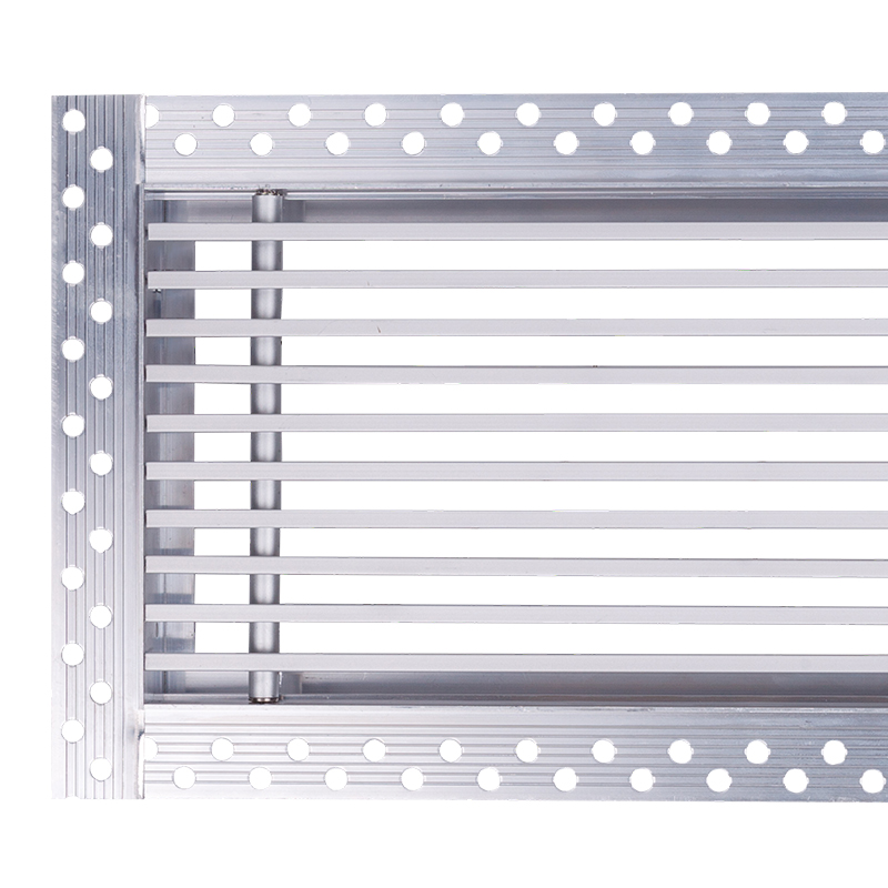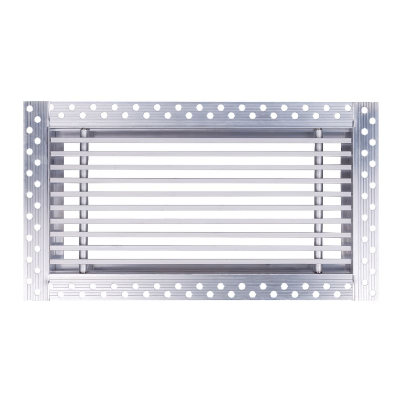 Данная решетка подходит для монтажа на любую поверхность под финишную отделку. Рамка и экран изготовлены из алюминия, опора экрана - из оцинкованной стали. Рама оснащена «полкой» 1,9 мм и рифлеными краями для большей адгезии финишного материала – шпатлевки, цемента. Решетка имеет съемную центральную часть с фиксированным углом наклона ламелей 0°. Она крепится к корпусу прочными металлическими тросиками, легко снимается для очистки и удобного обслуживания.