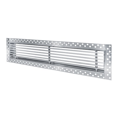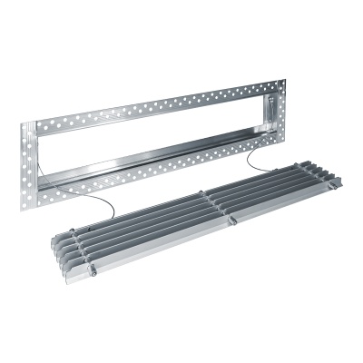 Данная решетка подходит для монтажа на любую поверхность под финишную отделку. Рамка и экран изготовлены из алюминия, опора экрана - из оцинкованной стали. Рама оснащена «полкой» 1,9 мм и рифлеными краями для большей адгезии финишного материала – шпатлевки, цемента. Решетка имеет съемную центральную часть с фиксированным углом наклона ламелей 0°. Она крепится к корпусу прочными металлическими тросиками, легко снимается для очистки и удобного обслуживания.