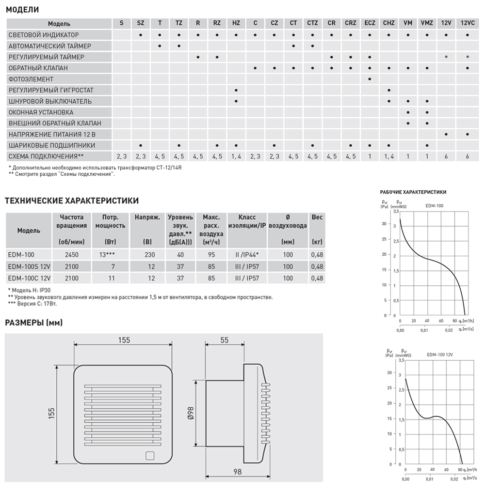 Максимальный расход воздуха составляет 100 м3/ч. Вентиляторы предназначены для присоединения к воздуховодам диаметром 100 мм.