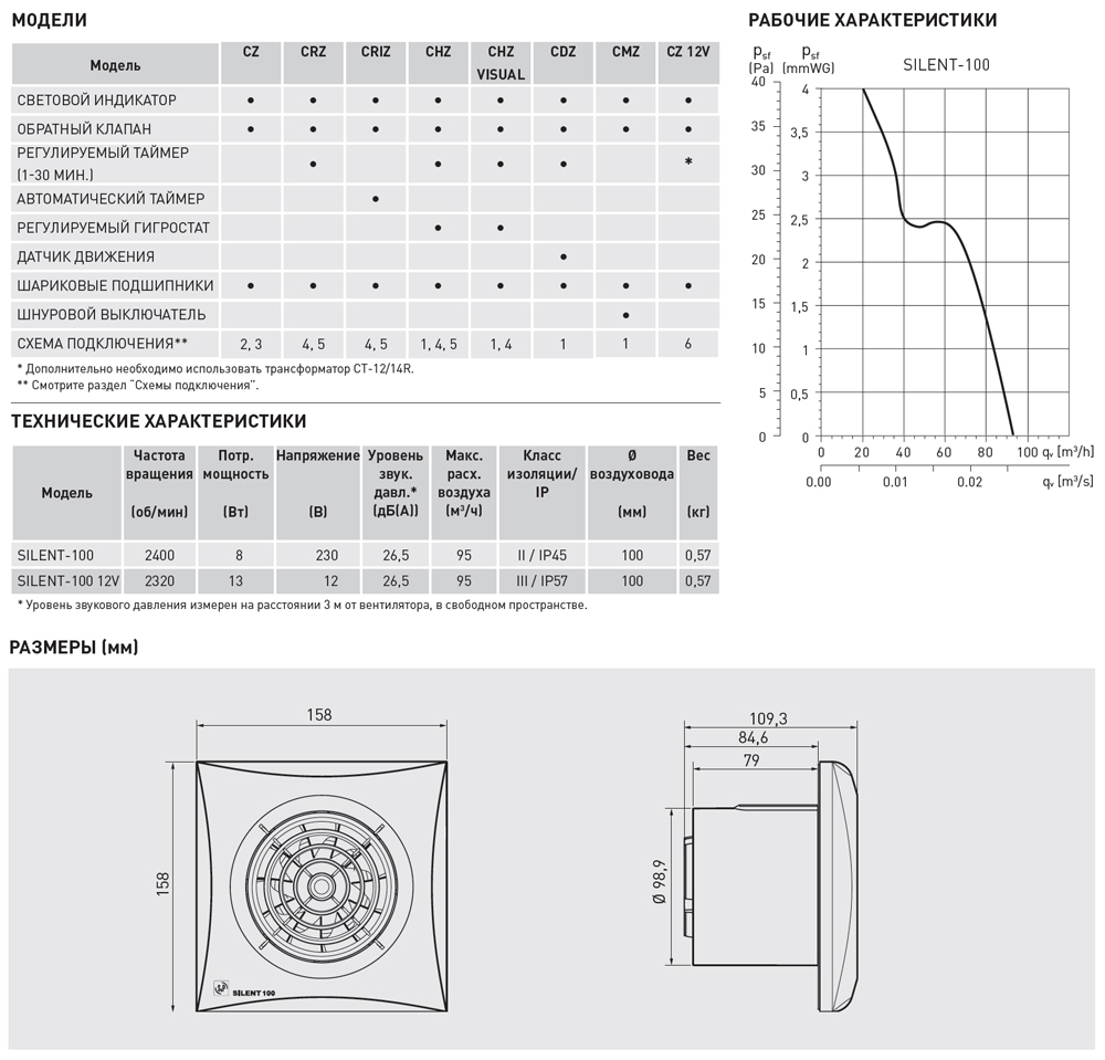 Малошумные вентиляторы SILENT имеют II класс электробезопасности, и не требуют заземления, класс защиты IP 45 и рабочую температуру воздуха от 0°С до +40°С.