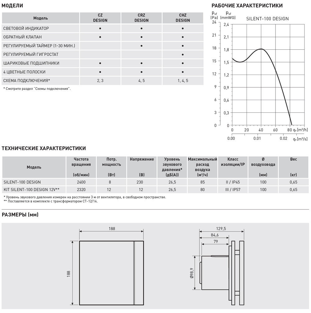 Вентиляторы SILENT DESIGN изготавливаются из высококачественного и экологичного АБС – пластика, комплектуются обратным клапаном и электродвигателем постоянного тока (230-50 Гц), класс изоляции В, со встроенной термозащитой.