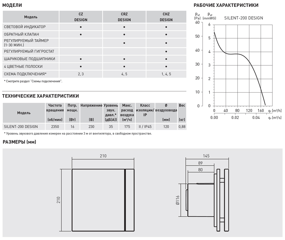 Вентиляторы SILENT DESIGN изготавливаются из высококачественного и экологичного АБС – пластика, комплектуются обратным клапаном и электродвигателем постоянного тока (230-50 Гц), класс изоляции В, со встроенной термозащитой.